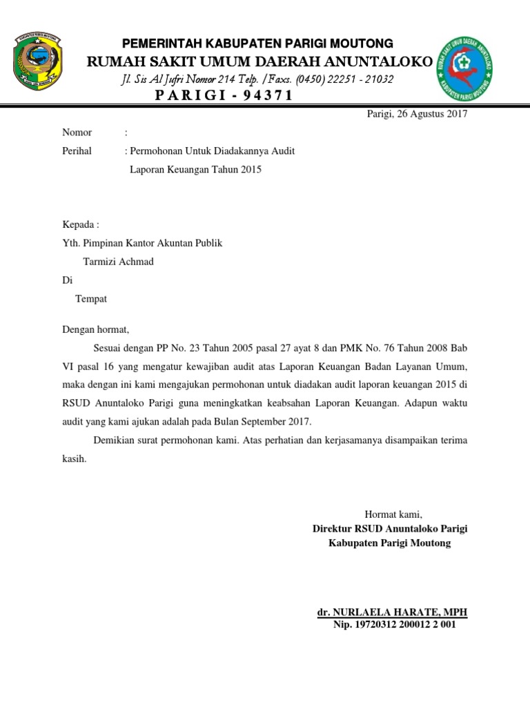 Berikut salah satu contoh draf konsep permohonan audit investigasi ke hadapan pengadilan negeri oleh pemegang saham minoritas suatu perseroan terbatas dengan alasan laporan keuangan tahunan perseroan tidak akuntabel serta tidak. Permohonan Untuk Diadakannya Audit Laporan Keuangan Tahun 2015. Surat penawaran adalah surat yang dibuat untuk menjalin sebuah kerjasama atau.