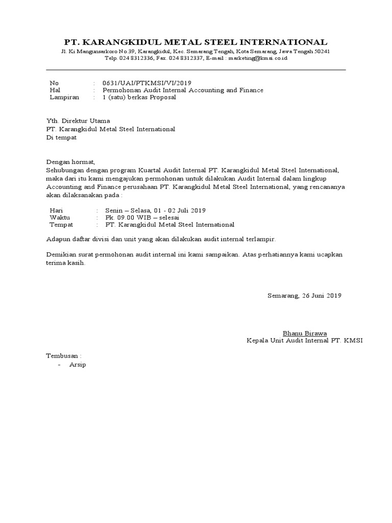. Contoh Surat Permohonan Audit Internal Finansial Perusahaan Manufaktur. Selain membuat surat undangan secara baik dan benar kamu juga harus. Doc Surat Permohonan Pemeriksaan Marni Uskono Academia Edu.